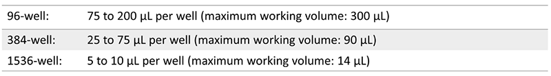 When using the Corning® spheroid microplates, the size of the spheroids is dependent on factors such as initial plating densities, cell-type, duration of growth phase in a spheroidal format and the desired size of spheroid at the time of assessment. A single cell suspension is required to seed into the microplates. If the cells used are particularly sticky, a 40 μm cell strainer may be required to achieve a single cell suspension. If cells are seeded manually, care should be taken to avoid touching the bottom or sides of the microwells with pipet tips to avoid damaging the ULA surface coating. The maximum working volumes for each microplate format are as follows: